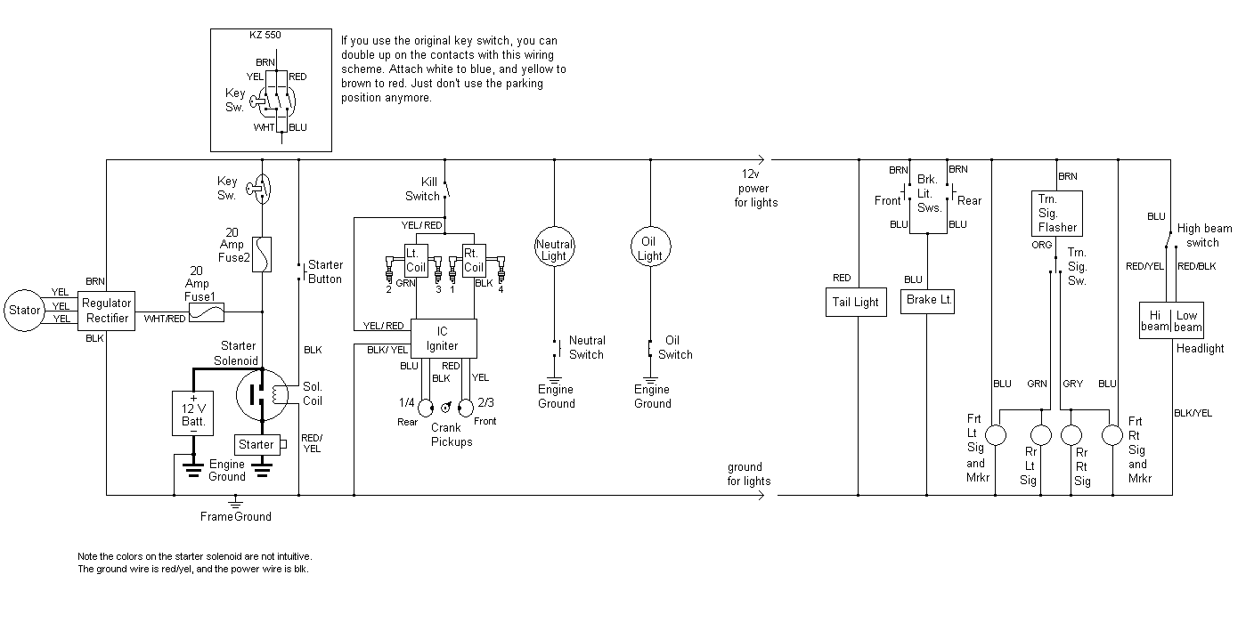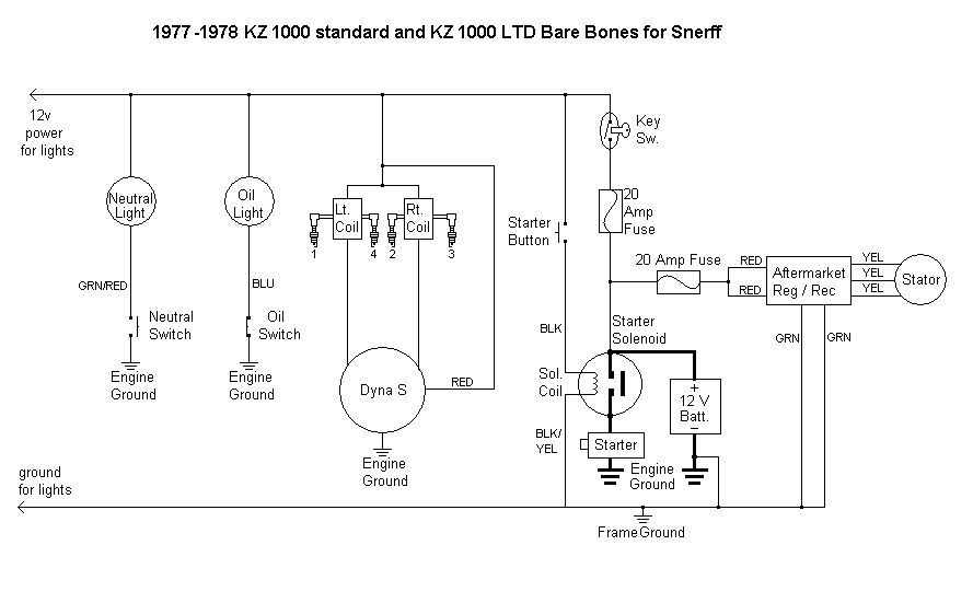 :S OK where do I begin..I have read and copied the diagragms to re-wire my "77" KZ1000...I have already pulled all the wires..it was a mess...I have the aftermaket R/R and also a new starter soleniod.(both from Z1 Enterprizes and made by Ricks Stators)...I am also using new ATC blade fuses and fuse block..what came on the bike is Accel coils and a Dyna S...I want to be sure that I can eliminate the 4 wire blocks/connectors...I have the 86 relay so I can wire the coils as per Wired Georges instructions...I also have put in a new H4 headlight and using Clear Alternatives Hayabusa smoked tail lens and LED light...where I'm pulling my hair out is wiring in the new soleniod coil wires...they are not matching colors to anything..I see in the bare bones diagragm that the Blk/Yellow from the Sol.coil ties into the Green/Ground..does this need to tie in or can I just Ground it to the frame??..I am not running anything on the bike.."bare bones"..no neutral,oil light..no gauges..just a headlight..no highbeam/lowbeam..highbeam only..brake light/tail light only..it looks like the "bare bones" diagragm will work just fine for me..any ideas or mods please let me know...PS..I'm also putting on some green LED pods but these will be wired to a hidden toggle and switched on only when the bike is parked...Thanks for any and all help...I can't wait to get this old beauty back on the road...crunch time...Bike Week is starting and I live 60 miles south of Daytona..Tracy