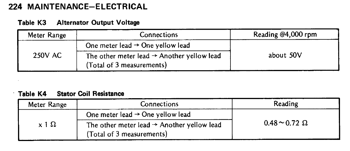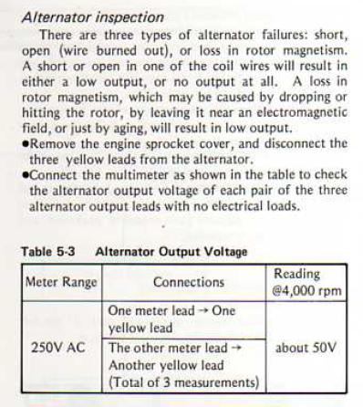 This is from the 650 manual, and it agrees with the 550 results too. I only have a paper version of the Clymer 750 manual, but it agrees... 4000 RPM should give about 50v AC for each of the possible pairs of stator wires.