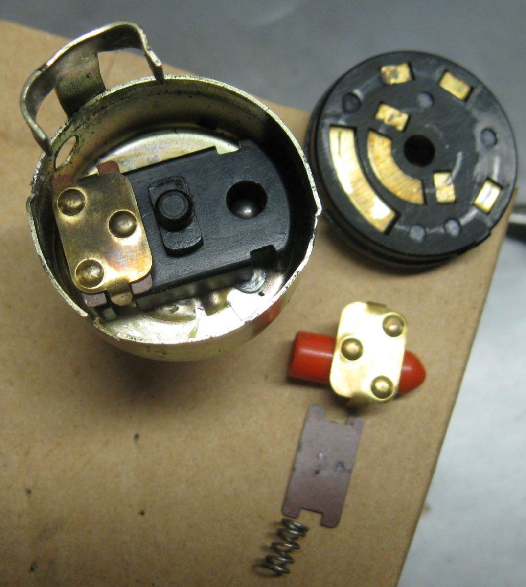 The upper cup appears below, upper left. Stationary contact disk upper right, and rotary contact components appear lower right. Three contact points are on each of two, interchangeable rotary contacts. The contact at 8 o'clock is in it's normal assembled position. The other parts (lower right) are the individual components of the rotary contact at the 2 o'clock position. The red tube is used only to hold the contact upright for the pic. A steel ball can just be seen in the hole of the rotor. This is for the positive detents at each position of the rotor. The spring holds the rotary contact firmly against stationary terminal disc, and the ball in the detents. The brown rectangular fiber insert goes between the spring and the three-point rotary contact, insulating the contact from the rest of the bike. (This is NOT the problem switch. It's a spare that we were willing to disassemble/sacrifice if needed as a learning tool.)