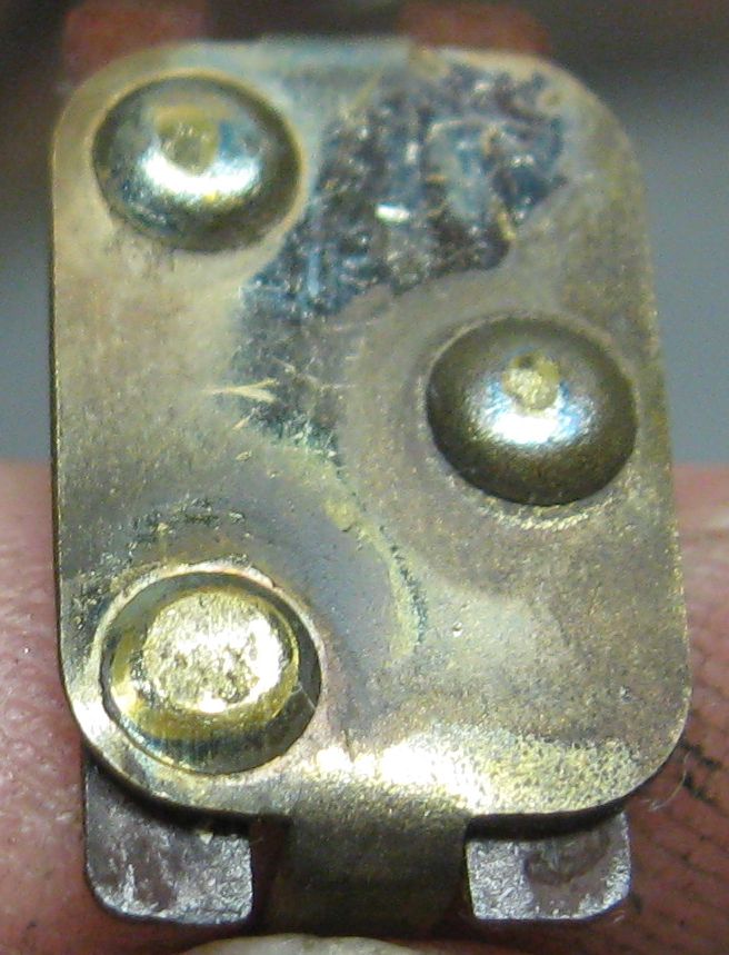 The pic below shows the stationary contacts of the problem switch. The dried old lube that had been applied at the factory has been cleaned using a degreasing solvent. Of particular interest here is the contact at 3 o'clock. This is the contact for the WHITE circuit. Note the depression that has been eroded in the contact. This is half the problem. At disassembly, this depression was coated with old grease that had carbonized and baked onto it. Physical burnishing was required to renew the contact surface.