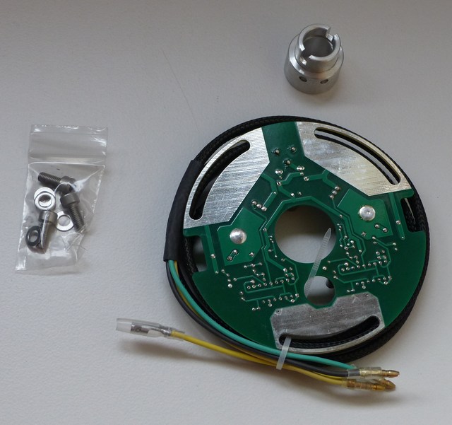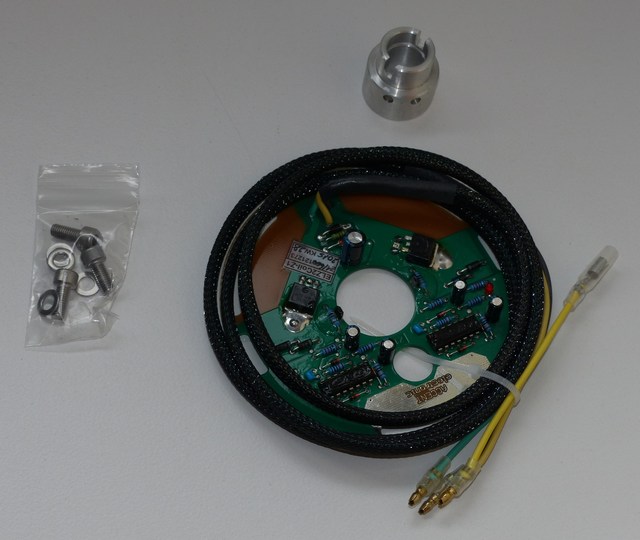 It works with stock and aftermaket 3 ohm coils. It has an auto off feature (3 sec. off no idle) and includes an LED (the small red dot toward the middle of the board in the photos below) for static timing (F mark) and longer adjustment slots. Price is 170 Euro.
