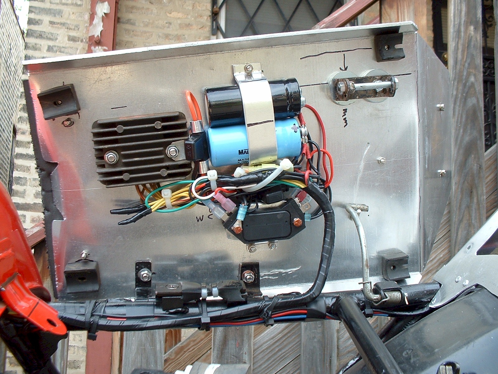 Another alteration you will need to make is to have a switch to turn off the lights on the bike until after it is running. Or I prefer a relay that automatically turn the lights off when the bike turns off. Then I use the starter button to trigger the relay to turn the lights on after it's running. The lights act like a short when they are not turned on and will drain away the voltage from the capacitor when trying to start the bike. Once the bike is running, you give it a rev and turn the lights on. The momentum of the engine keeps it turning and the lights will come on and the engine will continue running.