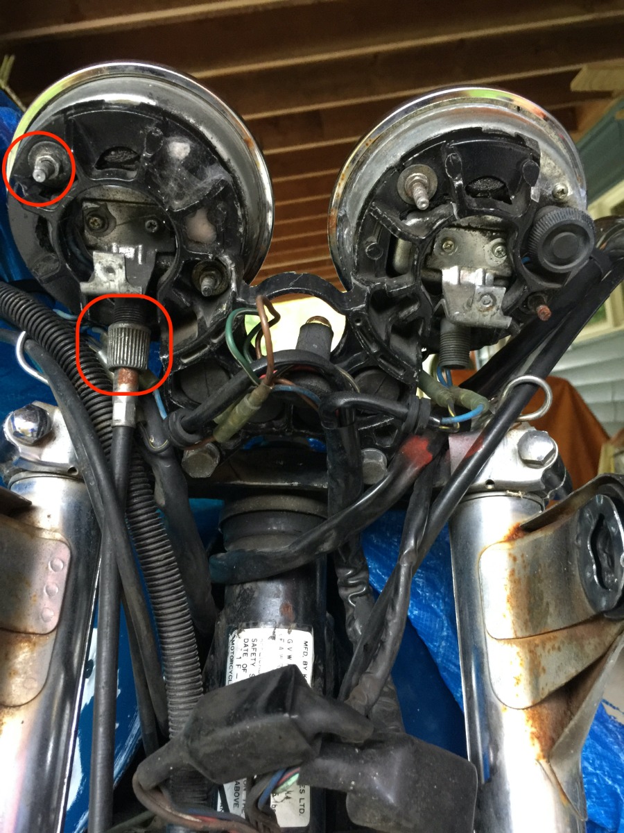 First photo below shows one of the tach the gauge nuts. It also shows the disconnect for your tach cable. Speedo has similar nuts holding the gauge to the gauge bracket.