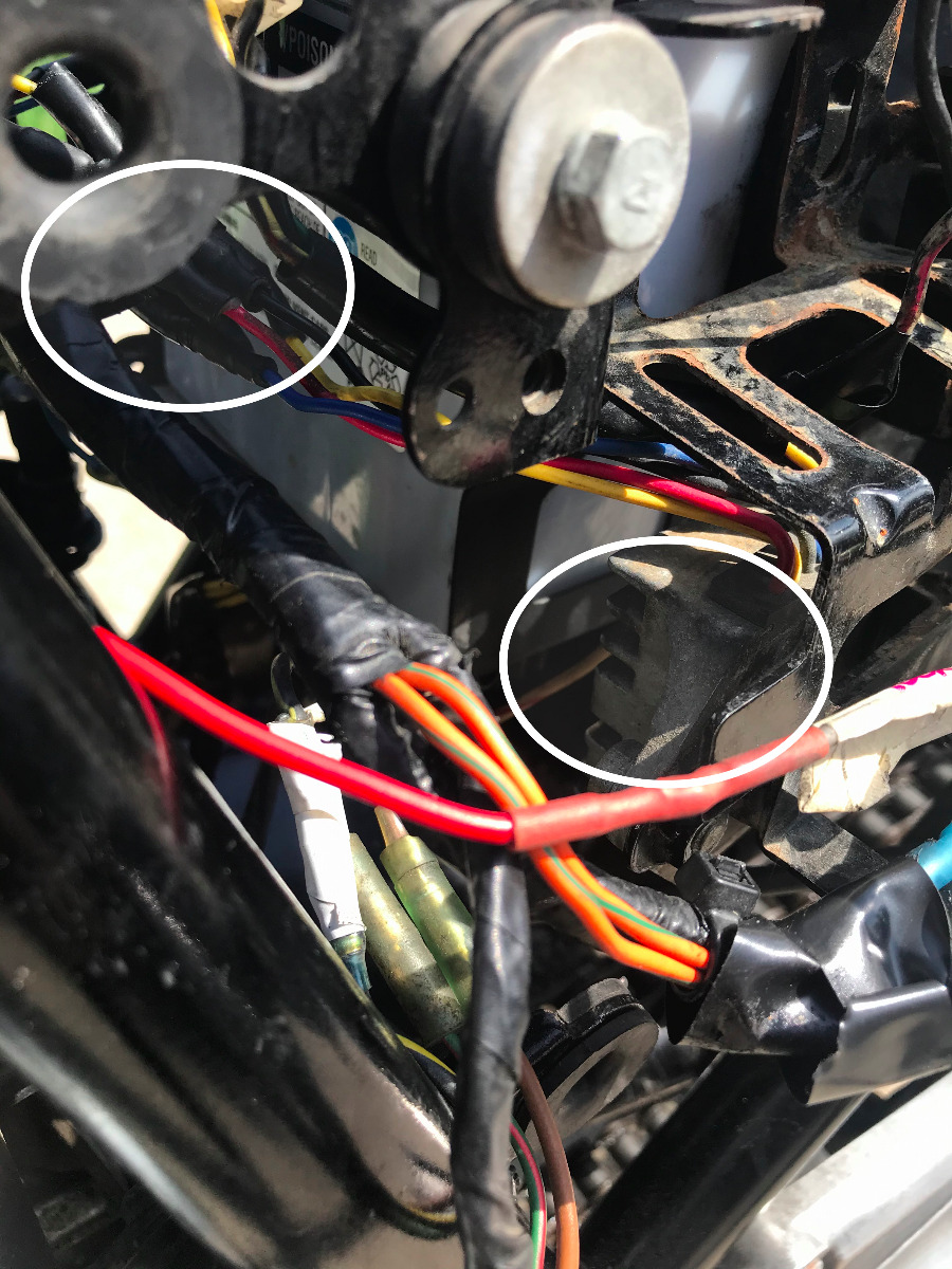 It's a nightmare. To be honest, the bike should be re-wired completely but I haven't had the time to do so. The previous owner had tried to simplify the original harness... and grafted some wires on it. I have the original owner's manual and you can see some of the remnants of the original harness. At the time of purchase, I had to add turn signals, and horns, plus fix break lights so the bike would pass the safety inspection, so I grafted those onto an already pretty modified harness.