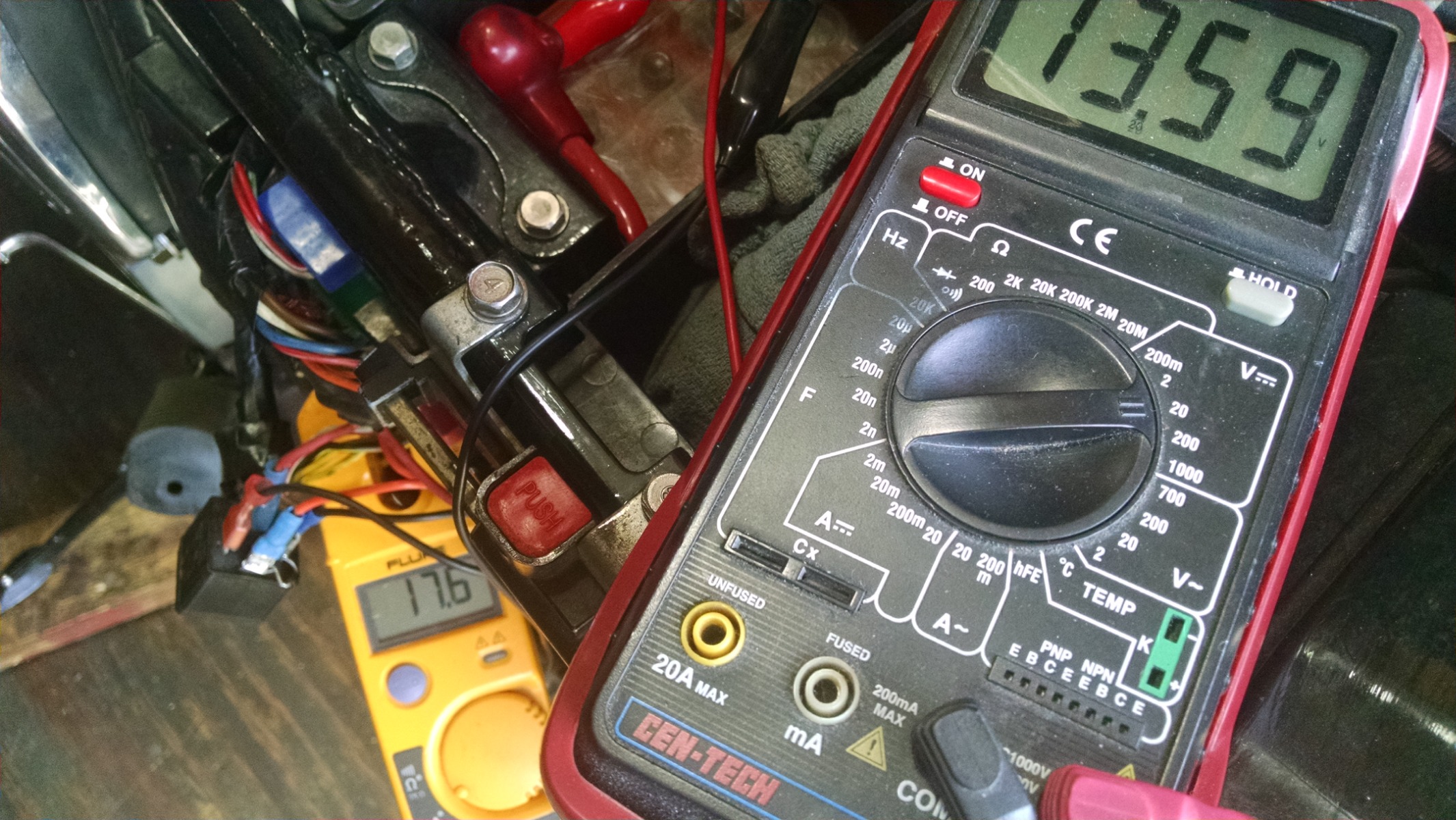 I used to have a nicer, more expensive meter Rick, but after loaning one out never to return, smoking one out on a 500 watt High pressure sodium ballast (poof! lol) and whatnot.. But with single purpose IC chips advanced technology now days, a half way decent meter can be had for little money. I now use a HF $20.00 cheapie on electronics that works fine. I did got to Gateway Electronics and replace those super short / cheap leads. The Fluke meter on the left is the one I carry in my tool bucket and use daily on AC circuits. It also has the amp probes that just go over the conductors and read circuit amperage easily. They are still $300.00, but hold up well tossing it in my tool bucket with the leather case protecting it. I was checking my stator current with it in the pic.