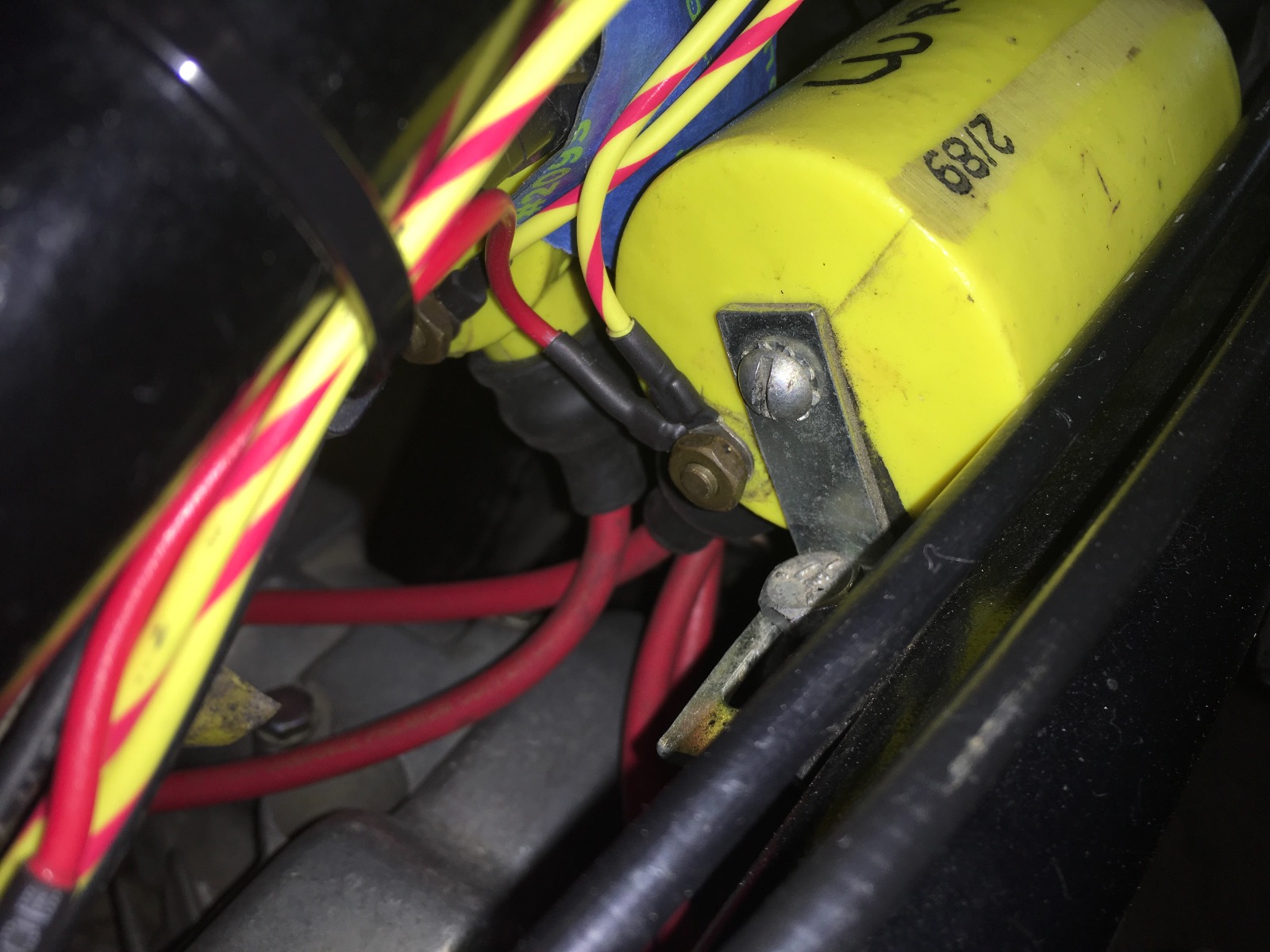 I made a nice shrink wrap connection with a ring connector and attached it to the coils primary. The red is the pickup power and the yellow/red is switched 12 thru the Wired George coil relay.