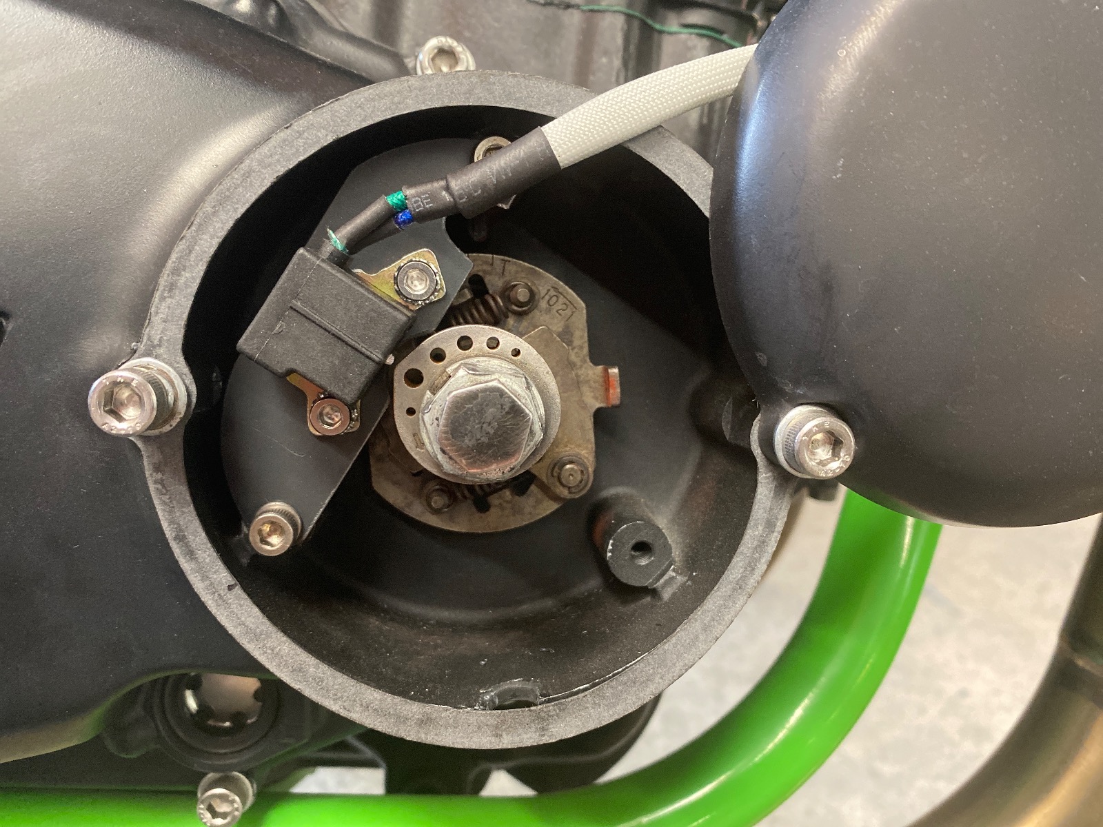Coil finally arrived and thankfully it was super simple to get it mounted exactly where the stock one sat. The wire colors were different though with a blue and green. So I just connected blue w/blue and green with white. Got a known working inline spark plug firing tester on right cylinder plug to see if I’ll get spark? All is on power wise, but no spark when cranking. Flipped the wires, same result. I’ve got an air gap of .483mm on my feeler gauge with the rotor lobe sitting just past the pickup. Oh and the Ohms on the new coil were 380.
