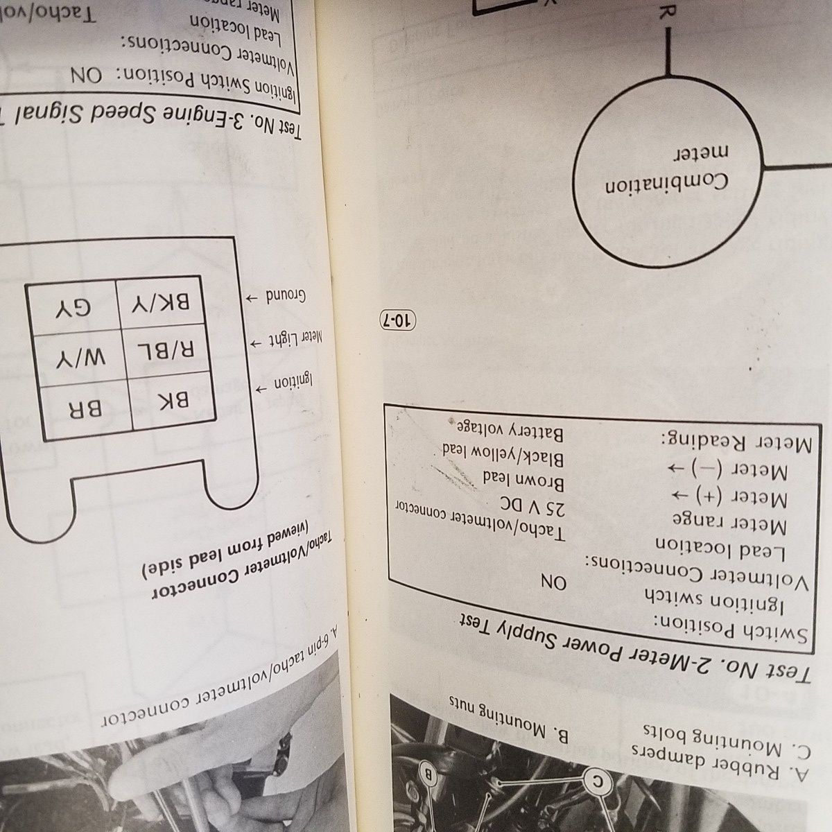 I am trying to figure out an erratic. bouncing tach needle and inop voltmeter issue on my 83 kz1100 shaft. I went thru the first two test in my manual and everything checks out so far. Onto the third test which is to test the push button tach/volt switch. I am stumped here. It says to check contunity between red, green. and yellow. I cant see any red, green yellow within the group of wires going up into the gauge cluster nor can I see the connector referenced in the pic on the manual. I have included pics of my manual and the test described within. Do I have the correct manual? Is that red, green, yellow connector up in behind the cluster requiring cluster removal? Anyone have similar issues and have any input on how to fix it? The bike still runs, starts, and charges fine and all the fuses under the seat check out.