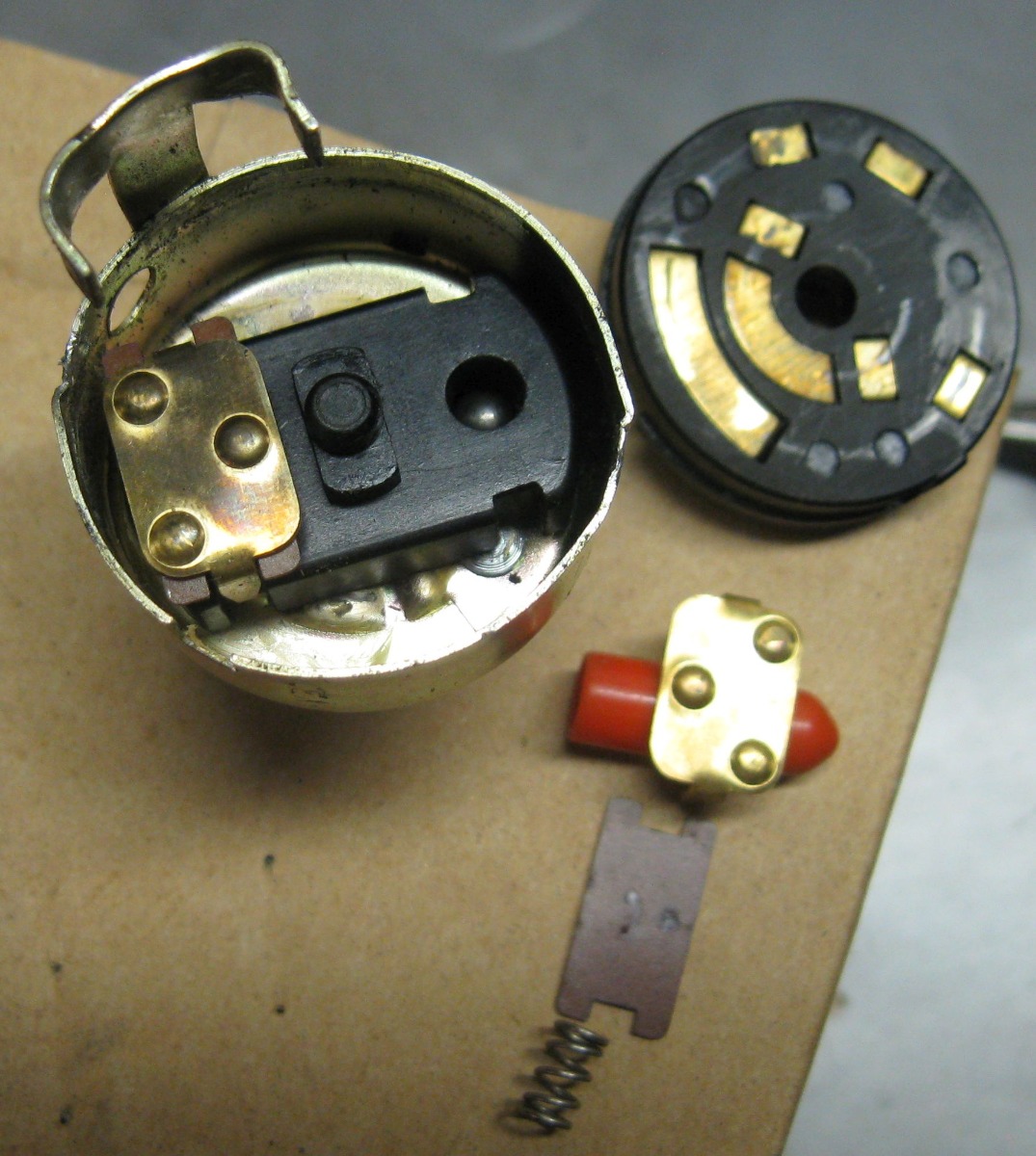 The three-point rotary contacts are interchangeable; if a movable contact point is too badly damaged, they may be swapped. FYI, the pressure spring and tiny ball bearing in the hole under the fiber insulator & rotary contact loads the rotary contacts onto the stationary contact plate. They won't go flying across the shop, but are very small & easily roll away. Recommend disassembly on a towel or similar. The red nub is only being used to get the angle right for the pic; it isn't part of the IG SW: