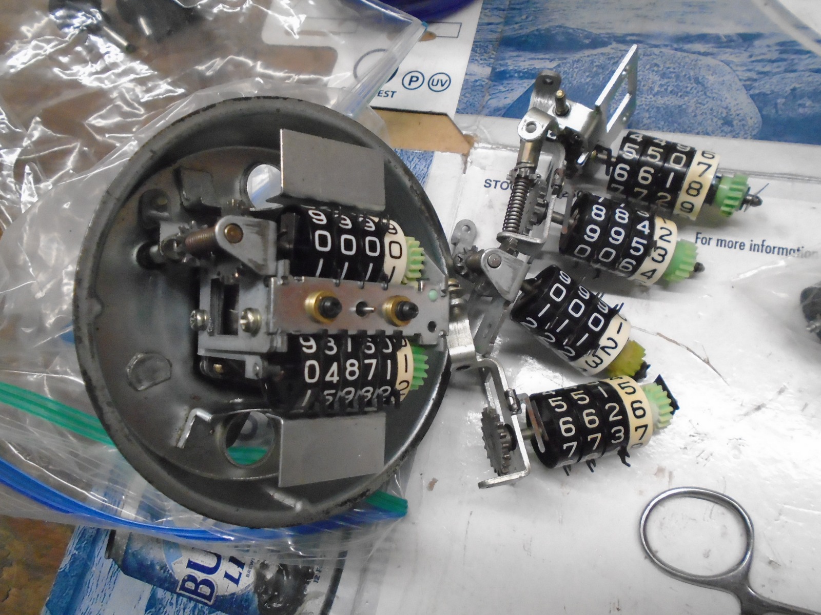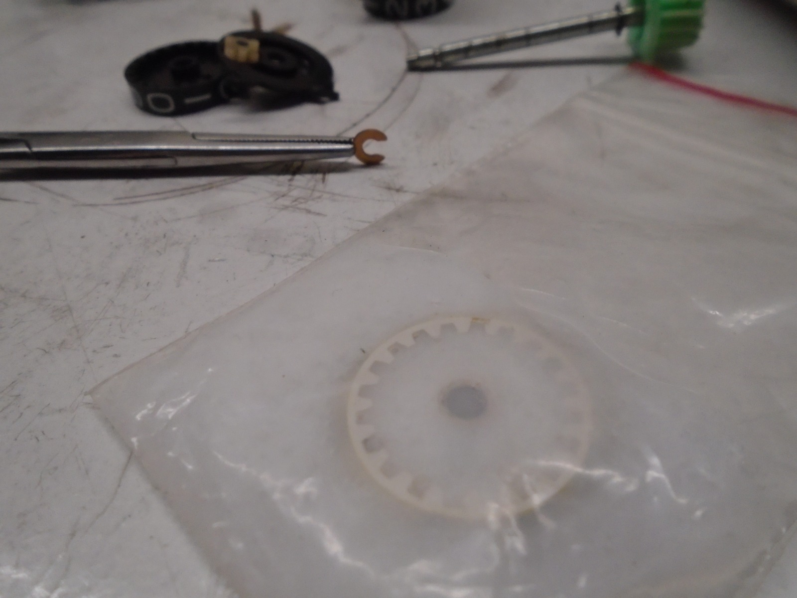 For Kaylinator and his KZ1000 and whoever else? This is what i do to whiten the registers for trip and mileage. A bit involved but once the needle and face are off..... I remove the Mileage register with a "custom" vice grip. The metal is folded over the shaft on the mileage register. One side requires opening quite a bit, the other just enough to relieve tension so the shaft can be slid out. A little brass e-clip has to be removed to slide the wheels/plates and gears off. Pay attention as to how they are removed to aid reassembly. Use a little baggie and pour in the Peroxide and whatever wheels need whitening. Let it sit in the sun for as long as it takes, check every couple hours. Wipe, don't rub, numbers won't be affected.