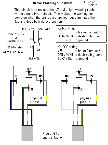 The three-wire brake-warning flasher unit uses the blue wire to detect the brake light filament whenever the brakes are NOT applied. If you apply a tiny voltage to the blue wire when the brakes are not applied, the blue wire is essentially grounded through the brake light filament. The brake light bulb filament is low-resistance so it seems like a direct connection to ground as long as the bulb only has a tiny voltage on it and is not lit up. That's what the flasher does...applies a tiny voltage to the blue wire. If it senses the blue wire is grounded, it means the low-resistance filament in the circuit is in tact. This means the brake light bulb is good.