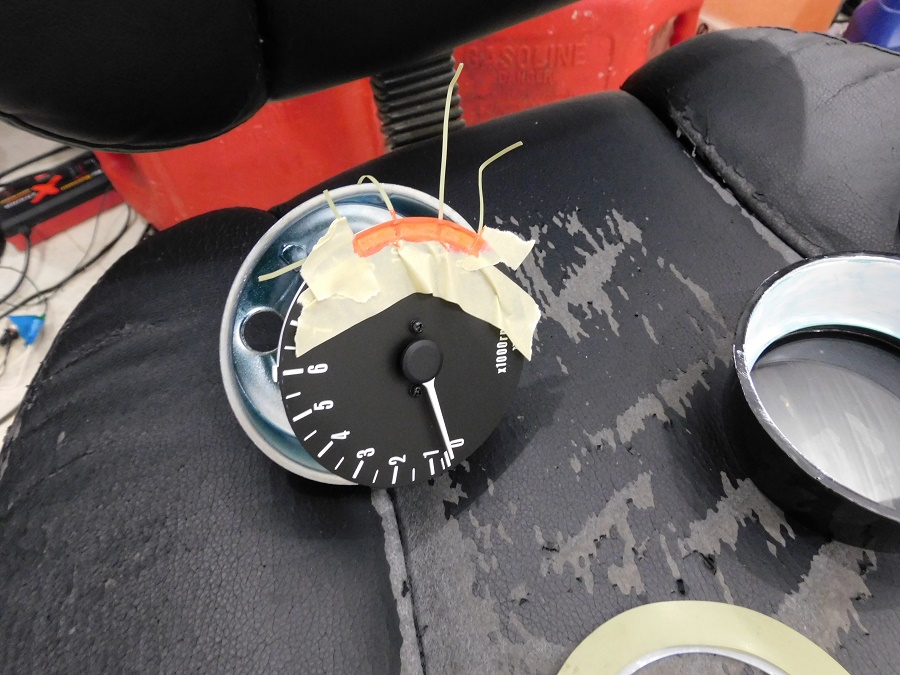 I hate how faded and dirty gauges look. I tried a reproductions set on my 900 but found the tach response to be kind of slow so I thought I'd try a little clean up of the factory ones that came off the bike. It was pretty straightforward. I used new crimp rings rather than reuse the originals. I painted the light baffle flat white so I could play around with different colored lighting. The two shown are green LEDs and Ultra Violet LEDs. I've got a set of red on order. I did cheat a little bit by not keeping the 500 rpm increment hash marks in the redline. I was afraid that a poor result would look worse than just skipping the little buggers. One photos is of the "before" and those streaks are on the inside of the lens.