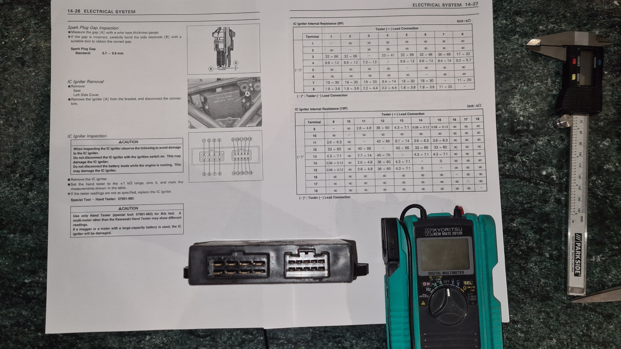 While the bike's apart, I'm also checking sparkplugs, ignitioncoils and ignition module. And this is where things get weird. My workshop manual says the ignition coils should be between 14.5 and 15.5 kOhm on the secondary side. However all my coils are 25Ohm?!