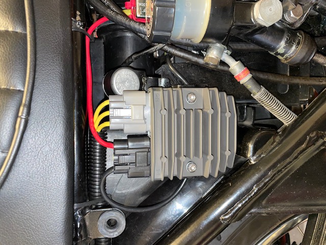 I bought mine a few months ago from Roadstercycle. Nice guy to deal with and has the real deal SH775. I bought mine as a kit with longer wires just in case I needed to relocate the unit. I was happy I got the longer wires in the end because if they had ben any shorter I would have been in trouble and had to splice wires. The extra expense of the "kit" was worth it to me for a cleaner, easier installation. As to the Triumph harness, well I bought one of them too and had to order it. We have no close Triumph dealers to me. I am still waiting for the Triumph wire harness to come in. Perhaps it's on a boat in the LA harbor. Or perhaps the shipping container it was in fell off the boat. In any event the Roadstercycle kit worked great and I am very happy with it. As was pointed out to me at the time I posted this pic, the grey wire connecter was not pushed down all the way. That has been corrected and it is a very solid fit. I had to adjust the location of the hazard flasher to clear the SH775, but otherwise it was an easy install. The SH775 bolted in where the OEM regulator had been.