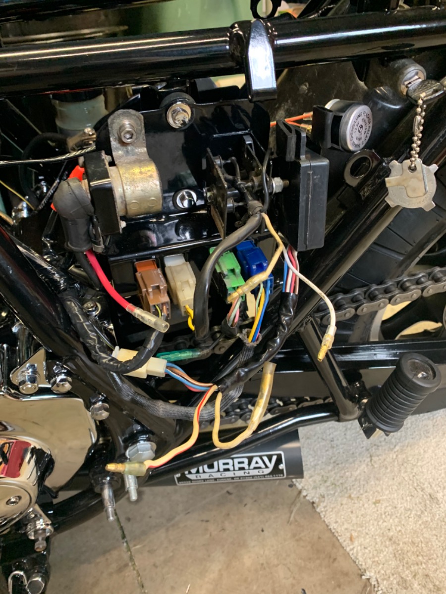 At work. I did find pictures of the battery box and relay bracket on my ‘76 Kz900 and it has a double female 4.9mm on the white. I’ll look at my ‘78B2 when I get home.