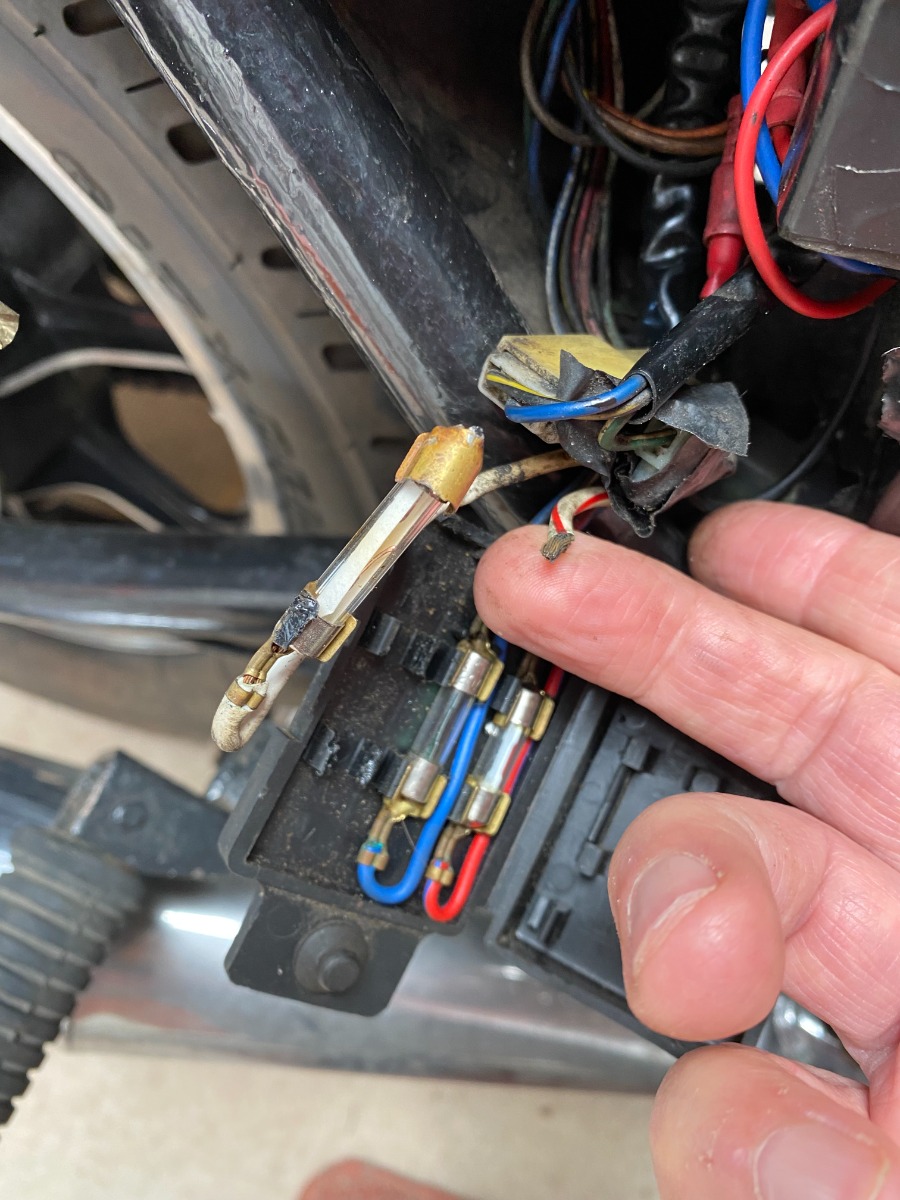 I've attached three photos. One of the fuse, one of the front-end of the fire-damaged brown horn wire, and one of the main wiring loom's seared electrical tape.