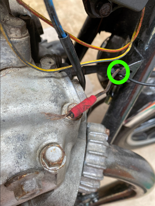 The terminals are really close to that clutch cable. There may be evidence of arcing on the clutch cable. Possibly inside the blue circle below. In fact, the positive terminal of the horn my have suffered heat damage unless it was already bent upwards.