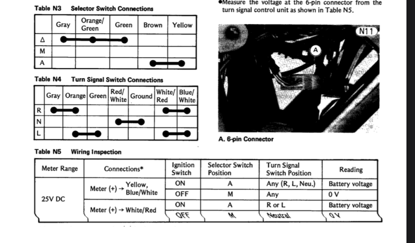 Using a voltmeter with ign on, turn signal switch in the rest position and combination switch in the "A" position