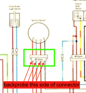 put it on the yellow/black wire in the red square(it doesn't matter where you probe the wire)