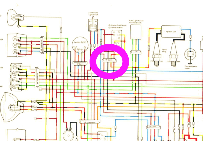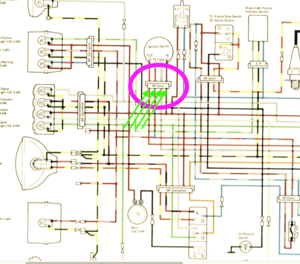 White from 20A fuse connects ok to White on 4P connector leading to ignition switch