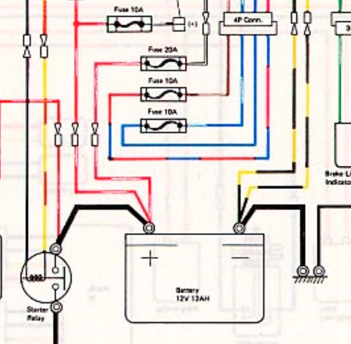 Thanks for the diagram, I poked around and noticed a black-yellow cable coming straight off the battery that has the same exact double bullet connector. I think someone must have put it back into the wrong plug at some point before I got the bike from my dad. Seems like it starts easier now too, I don't know a whole lot about electrics but I would have figured the starter would have tried to pull ~20a and blown the 10a fuse, but I wonder if it was only letting it pull 10a the way it was.