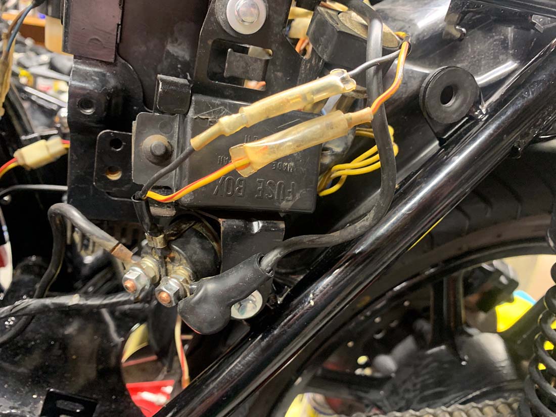 I have a running GPz550 right next to this one. I pulled the start button clasp off the running one and put it on the one on the bench. Prayed. No dice. Nothing at the starter button. No change.