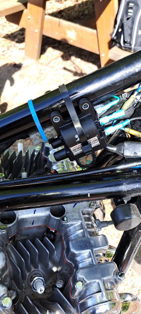 When doing it like i have by not removing the advancer unit i dont understand why i need to make a mark like the manual says,because i already have the F and full advance marks on the advancer ??. Anyway i installed it with the advacer unit because that is the only way it is possible . After some fiddling with installing the new coils temporarly and wires also temporarly i checked sparks on all 4 plugs simutaniusly.The spark was very strong and white .Then tried to fire up the bike and it fired up right away. One thing i noticed was that i had no choke on.I always had to use some choke to get it started.This time i needed no choke and the idle rised fast up to 3000-4000 rpm !! so i had to adjust it down .I think that is a sign that the bike had weak spark before and lots of fuel did not get ignited.The exhaust sounded much more crispy and strong/louder and when i held my hand over the end of mufflers i could feel it was a stronger pressure than before when i done this test.