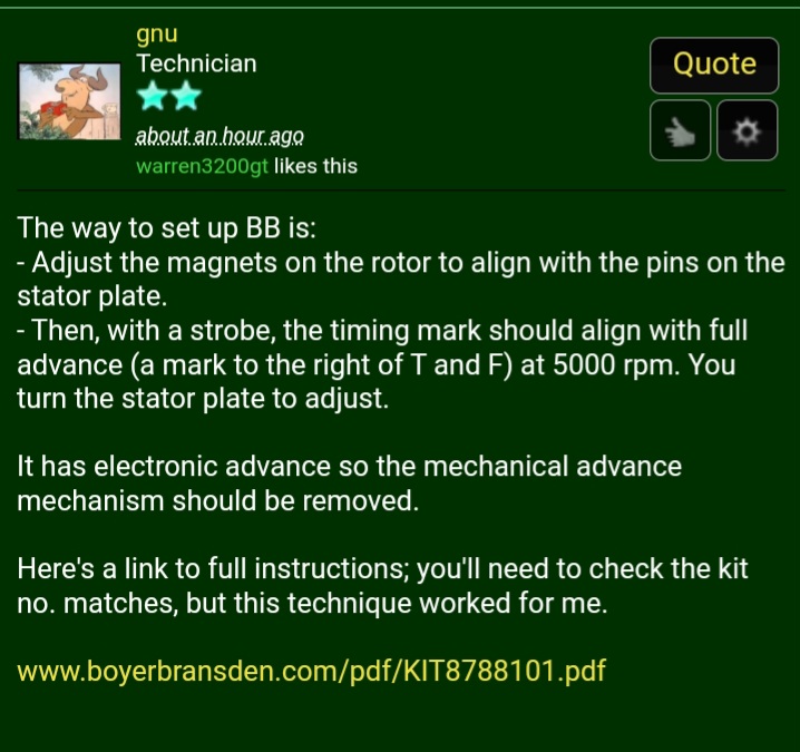 19 May 2024 14:37Thanks for the instructions they are almost the same as the manual that came with the boyer i gotI know it's been a long time since I've fitted a boyer but you have removed the mechanical advancer as I mentioned previously?