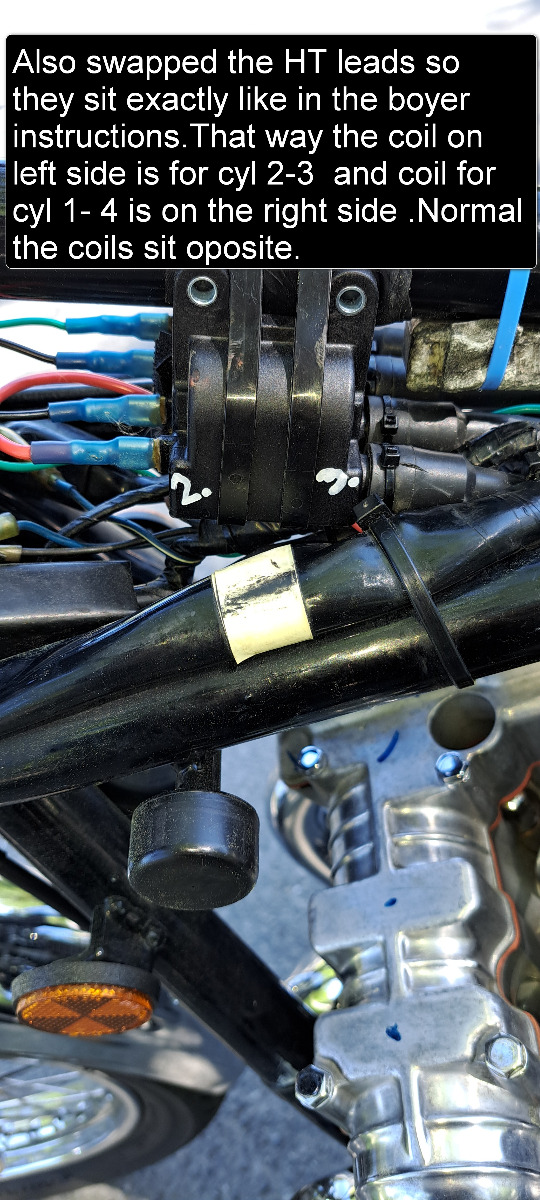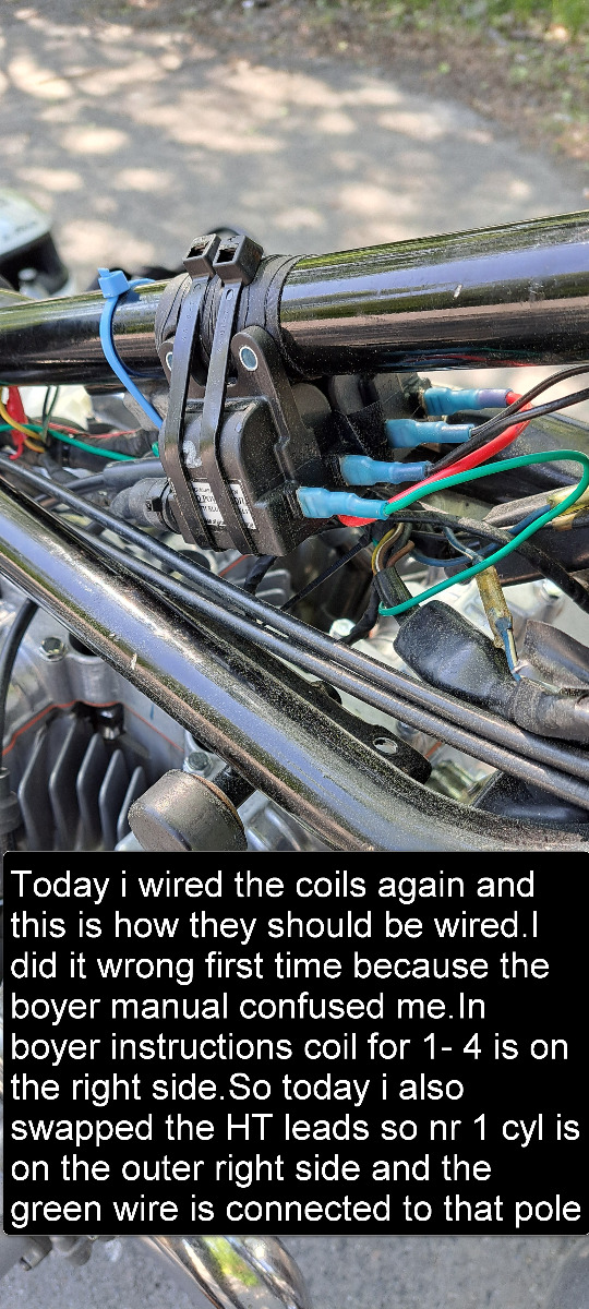First thing i did today was to ride down to the place i like to do some wrenching and rewired the coils .I also rewired the HT leads .The boyer drawed instructions shows that right coil is for cyl 1 and 4 and the left for 3 and 2. I did wire everything exactly as the instructions .Also put the HT leads in the same position as in the boyer drawing because the boyer special coils has + and - markings and maybe the ignition module takes that into calculations ? so now coils is in theory swapped. Then vent for a testride.I noticed that engine runs much smother and after engine was god and warm i went for some high rews on the highway.This time when passing 5000rpm there was no stumblig jerking misses and loss of power.The engine pulled real strong and reacted instantly when twisting throttle over 5000 im very happy. I rode for about 2 hours and several times i tested if it started to make problems going over 5000rpm ,but it was smooth and had no hickups.