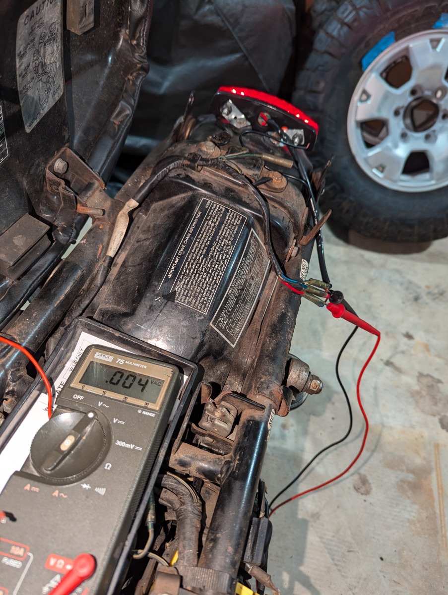 Thatyeti, hi hope you don’t mind me chiming in. Your last pic shows meter set up correctly DC setting. Now connect black lead from your meter to Negative post on your battery or a place on the frame, then to make sure meter is working correctly touch with the red lead the Positive post on battery. See what you get, if battery is charged you should get about 12volts. Now use the red lead to touch the wires you joined. Put your red lead on one wire and hit the brakes see if you get 12volts. Do this for each wire you spliced together. It’s a troubleshooting process but this will get you handy with the meter. Patience it’s a process