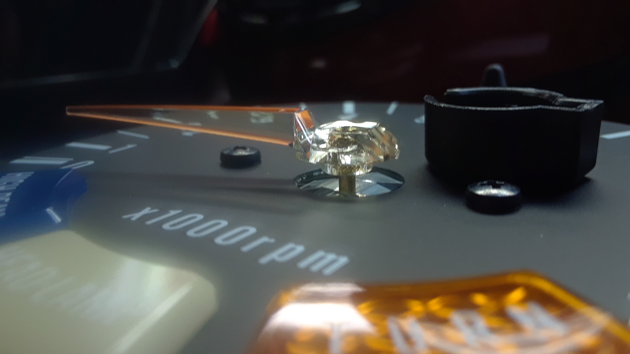 The trickiest part of servicing the gauge was getting the needle off. Daveo sent me two gauges so I could compare them. Before I found the root cause of the problem, I considered just swapping the face plates, since the real goal was to get the 160 MPH gauge working. The needle on the faulty gauge came off relatively easily, but the needle on the working gauge would not come off the shaft. Instead, the shaft started to pull out of the galvanometer movement. It seemed like if I pulled that out, it was never going back in. And I could not figure out a way to hold the shaft in place and get the needle off, so I gave up on that idea. Fortunately, as I said, the needle popped right off of the faulty gauge, so I was able to remove the face plate and then get down into the meter movement and find and fix the fault.