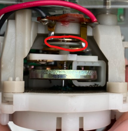 I HIGHLY recommend taking detailed pictures of the gauge before disassembly attempts are made. specifically, where the pin on the upper coil (closest to gauge face) passes through the upper plastic disc (circled in pic). there is a elongated gap here that I suspect is used to control the tension relation between the two coil springs. Also take note of the gap between the wire winding and the ring magnet.