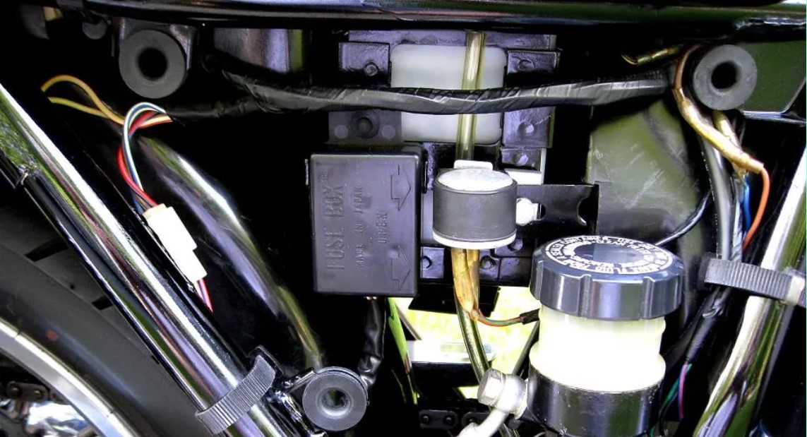 IM trying to identify what is missing on the right side of this KZ650 I'm working on. There is a round rubber holder but nothing there right beside the fuse holder box. I've attached a picture.