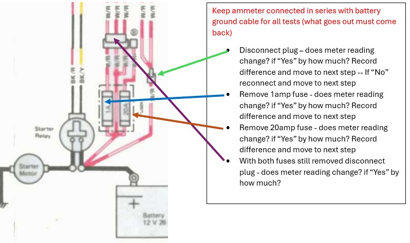 I believe any other places batt + goes other than a fuse, is the starting solenoid, and voltage rectifier. Could you disconnect those see if it stops??, if it does, connect one at the time and read current. If not fused, most suspect would be the rectifier. This is also connected to alternator and regulator.