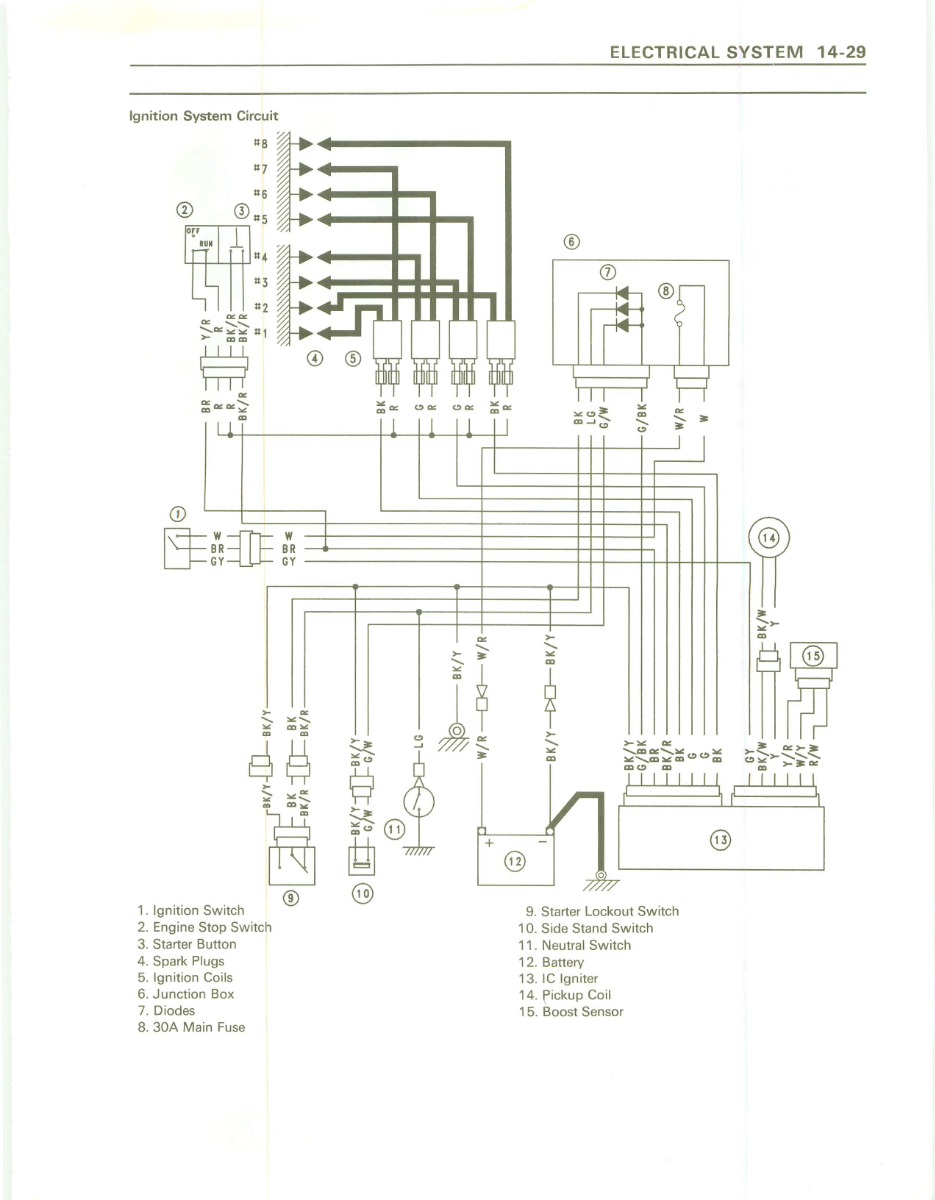PS: Kawasaki's of this era use a grey wire from the ignition switch to the IC igniter as an "anti-theft" system - there is a resistor in the ignition switch that reduces the voltage on the grey wire to approx 9v - if the module see's more than this (or no signal) it assumes the bike is being "hot wired" and won't start ?