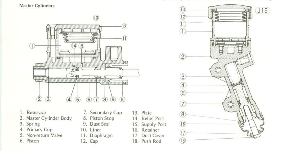 I'm having a small problem with the rear master cylinder on my 1979 kz1000 b3, the parts look exactly the same as the pics above, i have the piston out bu there is more up the hole, the spring and another seal by the looks of the pics, i have a clymer manual which doesn't show anything usefull for the master cylinder, how do i get the other seal and the spring out from the cylinder, i'm asking here cos i dont want to wreck anything by having a go first