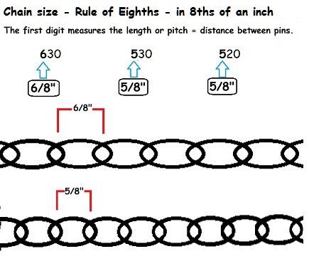 Reducing chain size from 630 or 530 to 520 narrows the overall chain width by 1/8", which provides an additional 1/16" between the chain and tire sidewall.