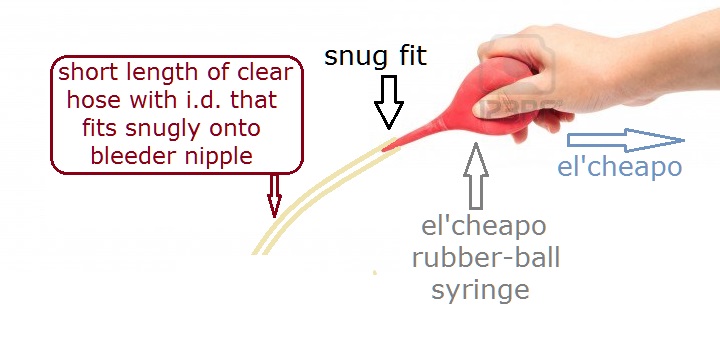 When filling the brake system with fluid, may use an inexpensive rubber ball style syringe with a short hose attached to the end which connects snugly over the bleeder nipple.