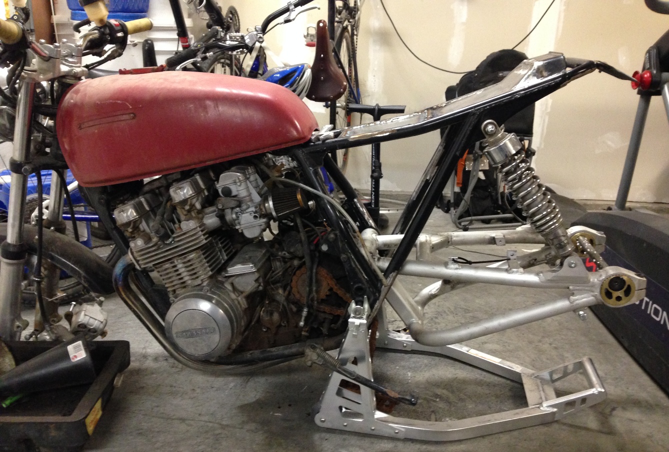 sHere is a 99 ZRX1100 swaingarm and shocks on my 82 GPZ750 framed ELR. It fit pretty easy with some minor modifications to the pivot. I also had to space out the upper shock mounts to line up with the swingarm. It came out really clean and looks factory.