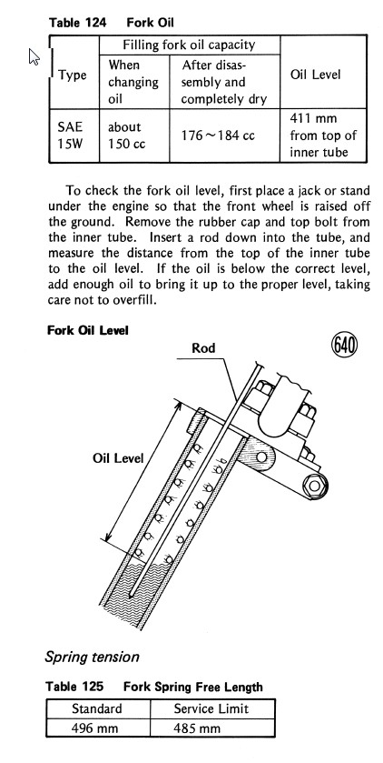 05 Apr 2014 13:38I copied the pages from my 1979 750 twin factory manual. Probably similar for yours, no guarantees. You do put the front end up on a jack to clear the front wheel then check oil level with a dipstick method.buffalowinger wrote: I'm trying to figure out how many cc's of fork oil to put in my kz750 front end. I just disassembled them, and cleaned everything and changed the fork seals, now I can't for the life of me find out how much fork oil to put in them. Any help would be greatly appreciated.