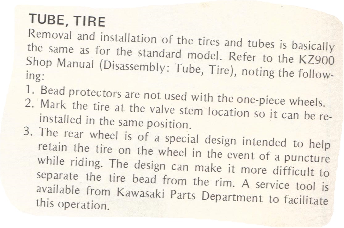 In any event, here are excerpts from the FSM supplement pertaining to the KZ900-B1 LTD's genuine Morris Mag wheels that were fitted at the factory: