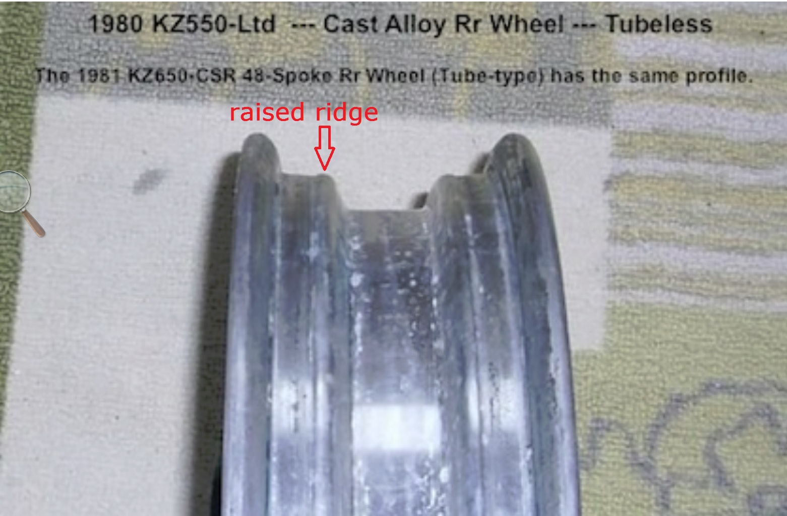 It's interesting that the 1981 KZ750-E2 does not have the ridges. That's one of the earlier KZ's with tubeless rims; I think 1980 was the first year to offer tubeless. Just speculation, but I wonder if the reason the ridges were added to later KZ wheels as shown in the image I posted was that problems were reported by some owners. If that was the reason, and if the problems were safety related, it probably would take less than one in 10,000 to scare Kawasaki into changing the wheel design. In any case since the 1981 KZ750 wheels are marked Tubeless, if the 1983 KZ650-CSR wheels are tubeless type I suspect they will also be marked as such. Ed
