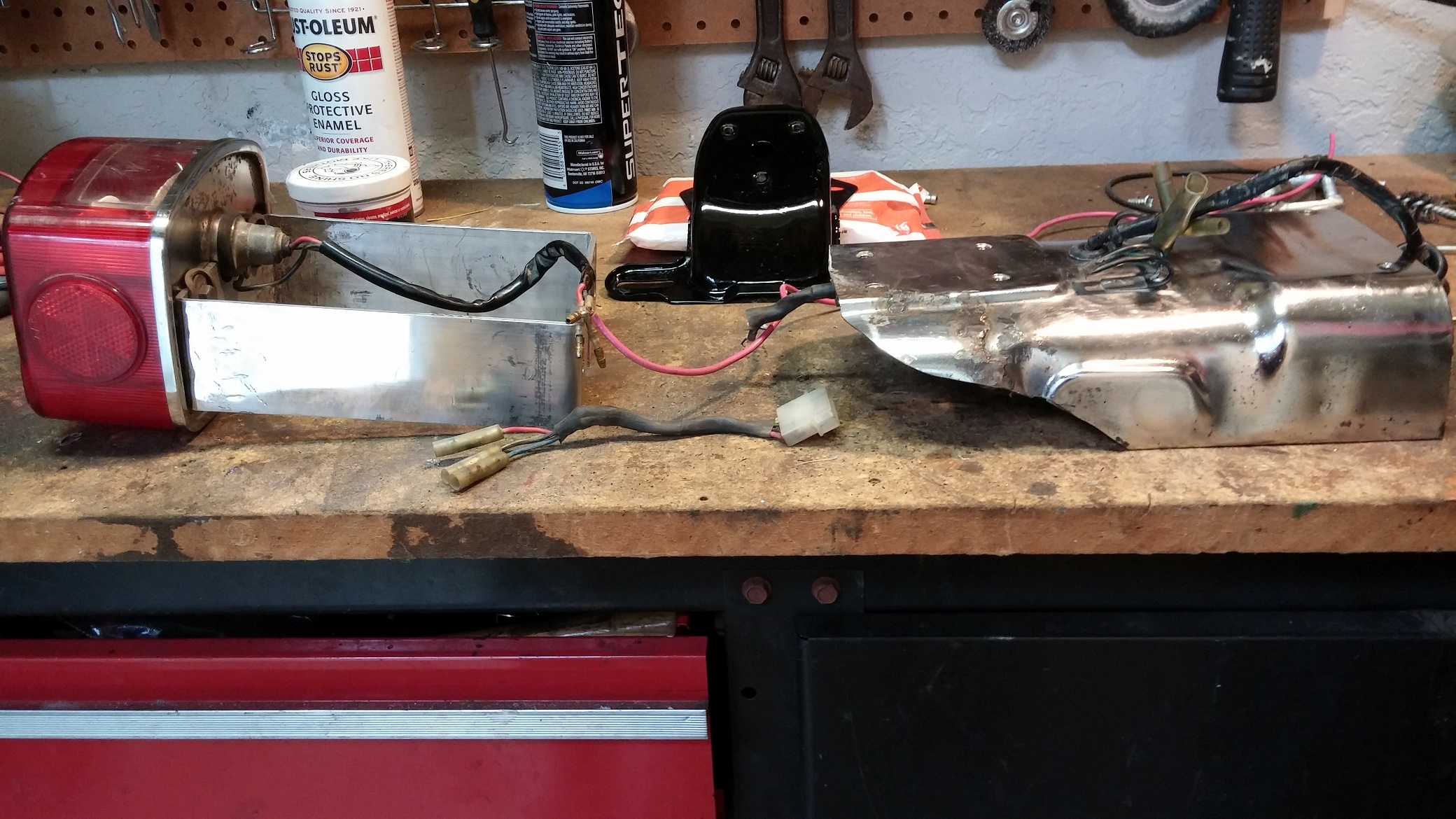 Final assembly. Should have the rear wheel back on in a couple of days to see how it really looks. I may redo another light bracket so the light fits about a 1/3" inside the tail. But I don't want it take away from its functionality so we'll see.