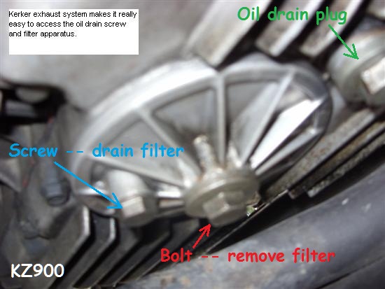 After the usual crankcase draining, and before loosening the filter bolt, would also drain the filter (if there's a separate filter drain plug), so as to create less of a mess when loosening the filter cover bolt.