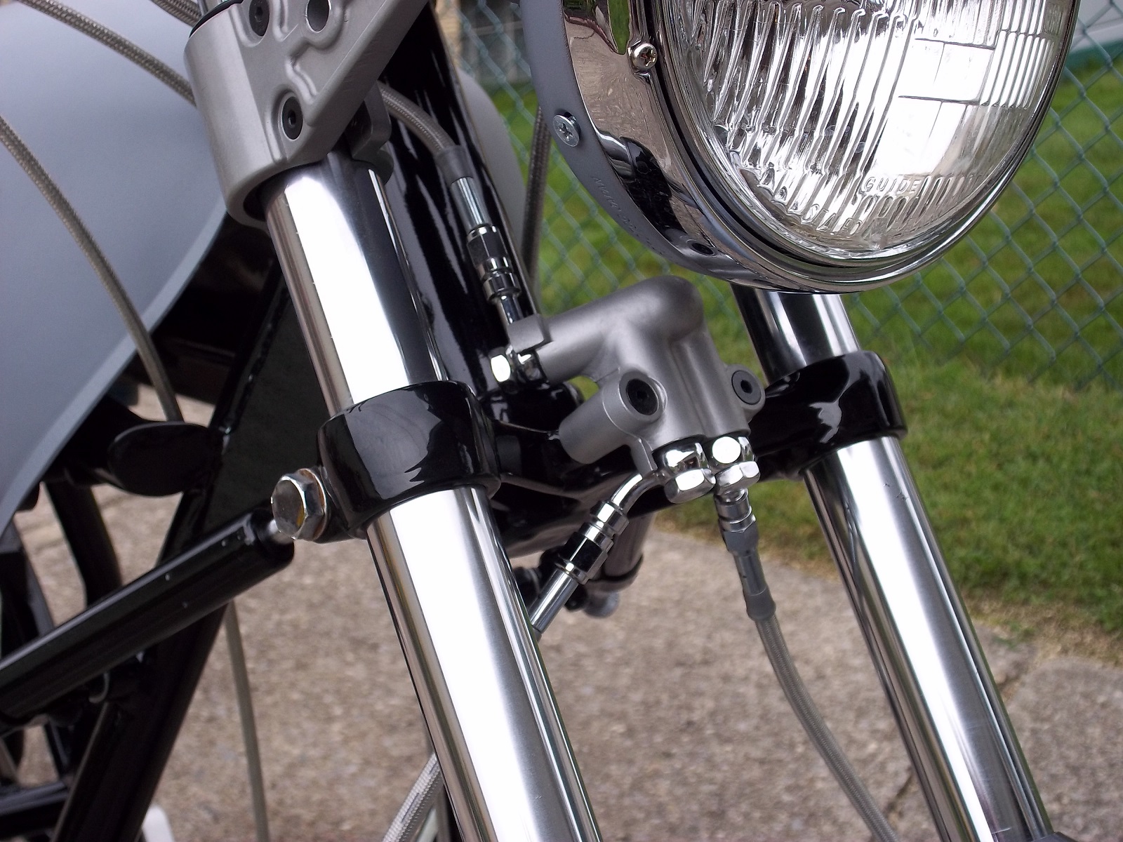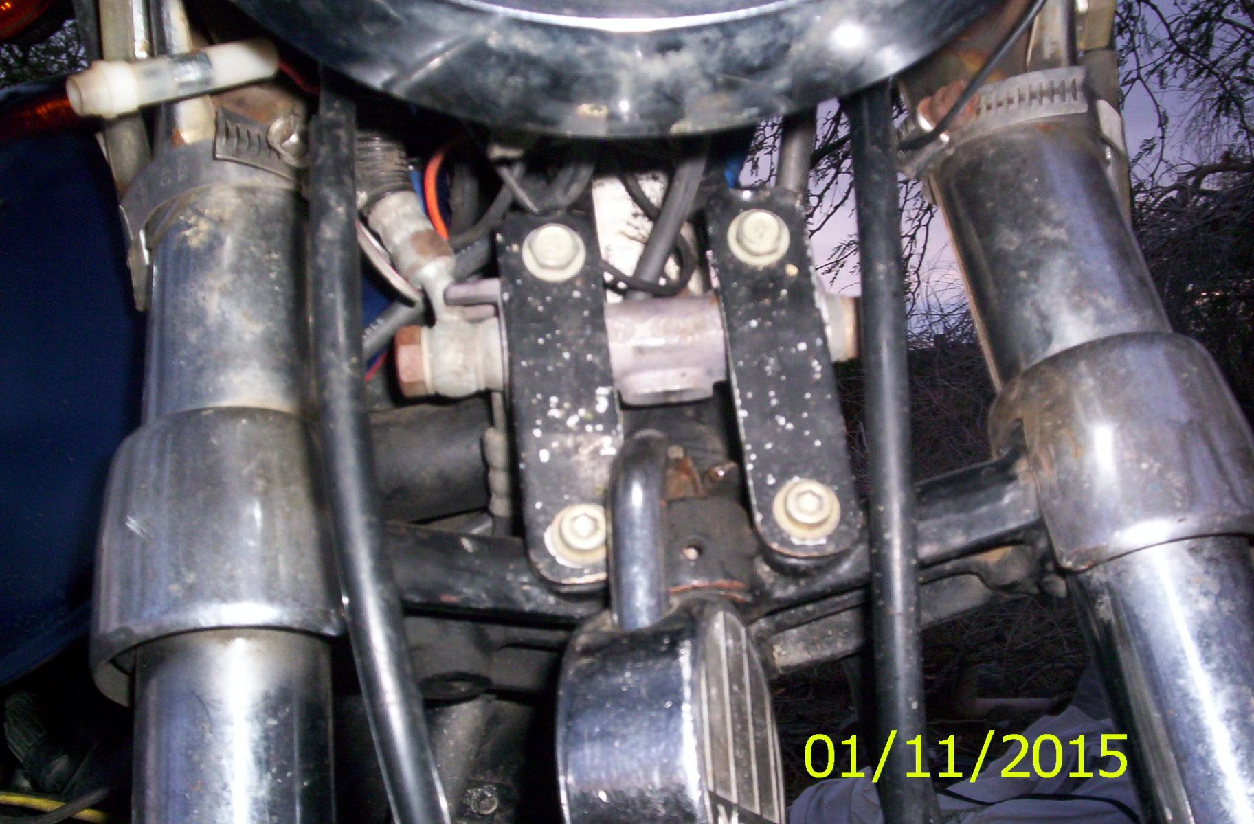 Mine is a little different. The stock one like the one in question was in the wrong place for my lock on the forks. I don't recall what kind of bike this one came from being so many years ago and I had to use a double banjo for the line coming from the master cylinder to the right caliper. The other side leads to the left. I plan to buy a chrome Kawasaki fork cover to hide it but it's a low priority right now. The master cylinder is from a later model duel disk set up. The switch is built in.