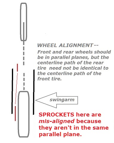 Correct sprocket alignment requires both sprockets being in the same parallel plane (regardless of the bike's position).