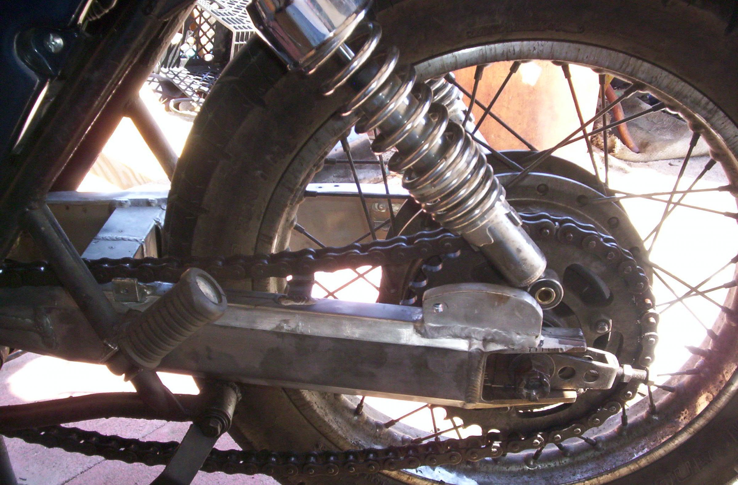 Got it on. Nice and tight, no slop. Trouble is, the bike will be lower and there is no room left on the adjuster. I'll have to spread the muffler mounts or cut off the mount eyes to lower it. I'm ordering a 98 link chain. STILL NO SPROCKET.