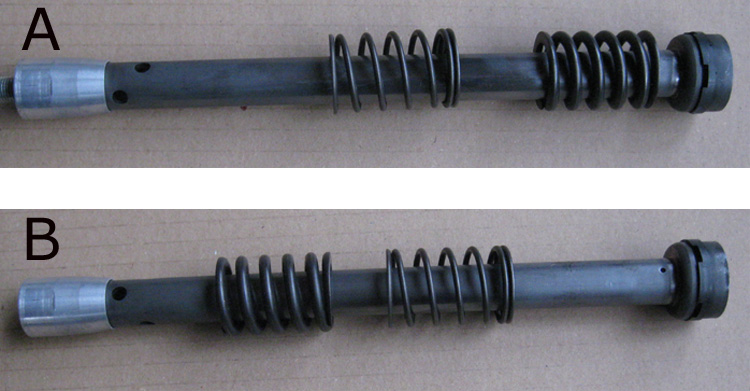 The B2 has two springs (rebound springs?) on the damper rod, a thin and a thick, but which one goes where? The problem is that when I took the forks apart one came out like pic A below, and one came out like pic B - I can't find any info or pics in any of my manuals and the parts diagram is too blurry to determine which spring is which. Does anyone know which way is correct?