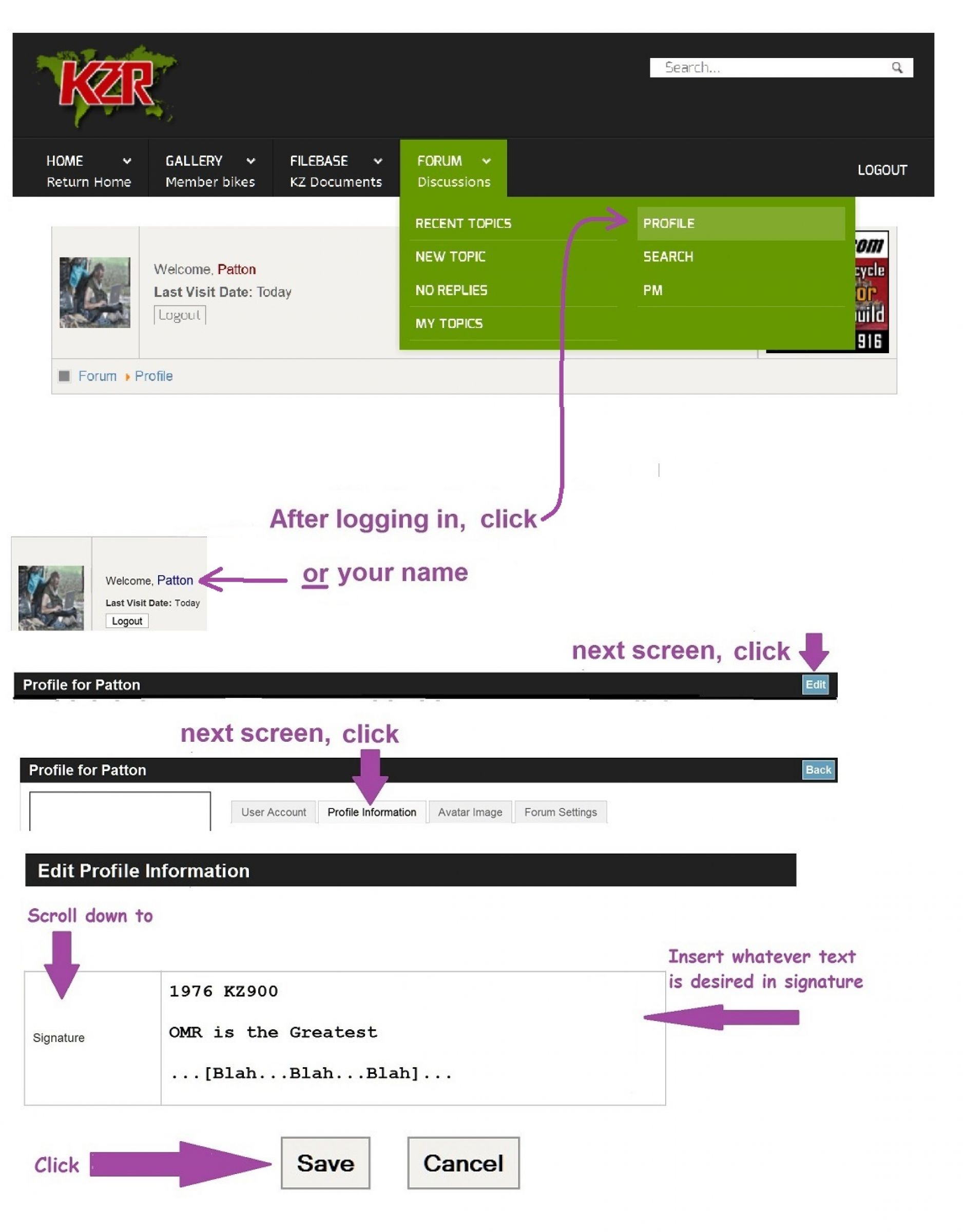 Creation of a signature in a poster's profile is a means to automatically include information about the bike year and model in each post, which information is helpful to viewers. The signature helps avoid needing to search though the thread in hopes of finding the information.
