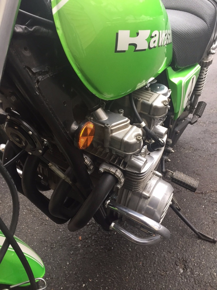 1978 KZ650 C2, 130K kms, Delkevic ex, EI, CVK32, PMC easy clutch, ATK fork brace, steering damper, braced swingarm, ZRX shocks, 18" Z1R front wheel.